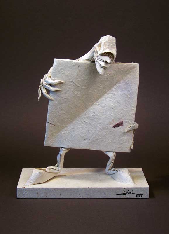 « J’ai travaillé l’argile, la pierre et le bois avant de travailler le papier. Je préfère créer des figures humaines plutôt que des animaux. Avant de pouvoir essayer de plier une figure humaine complète, je me suis entraîné à faire des masques et des visages pendant de nombreuses années. C’était plus qu’une simple production, c’était le processus permettant de donner vie au papier et surtout, d’improviser partiellement pour que chaque modèle soit unique. C’est différent de l’origami traditionnel où chaque étape est parfaitement définie pour que les plieurs puissent produire des copies exactes. Tous mes modèles sont absolument uniques ».