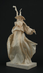 Autre différence importante : l’origami traditionnel est censé être une petite distraction populaire que le grand public peut pratiquer, et donc, supposé être relativement simple, rapide, reproductible, décrit du premier au dernier pas. Au lieu de cela, cette série de Barbares est le fruit de nombreux essais improvisés que j’ai commencé à expérimenter surtout avec les masques. Le nombre de plis est ici très important (plusieurs centaines) ; les déformations des couches de papier plus ou moins aléatoires et souvent complexes, et ces modèles comportent toujours une grande part d’improvisation. Alors c’est moi, et parfois plutôt que moi, le papier lui-même qui a dirigé le travail. Mes modèles ne sont donc pas reproductibles. Même moi, je suis généralement incapable d’en produire une copie !