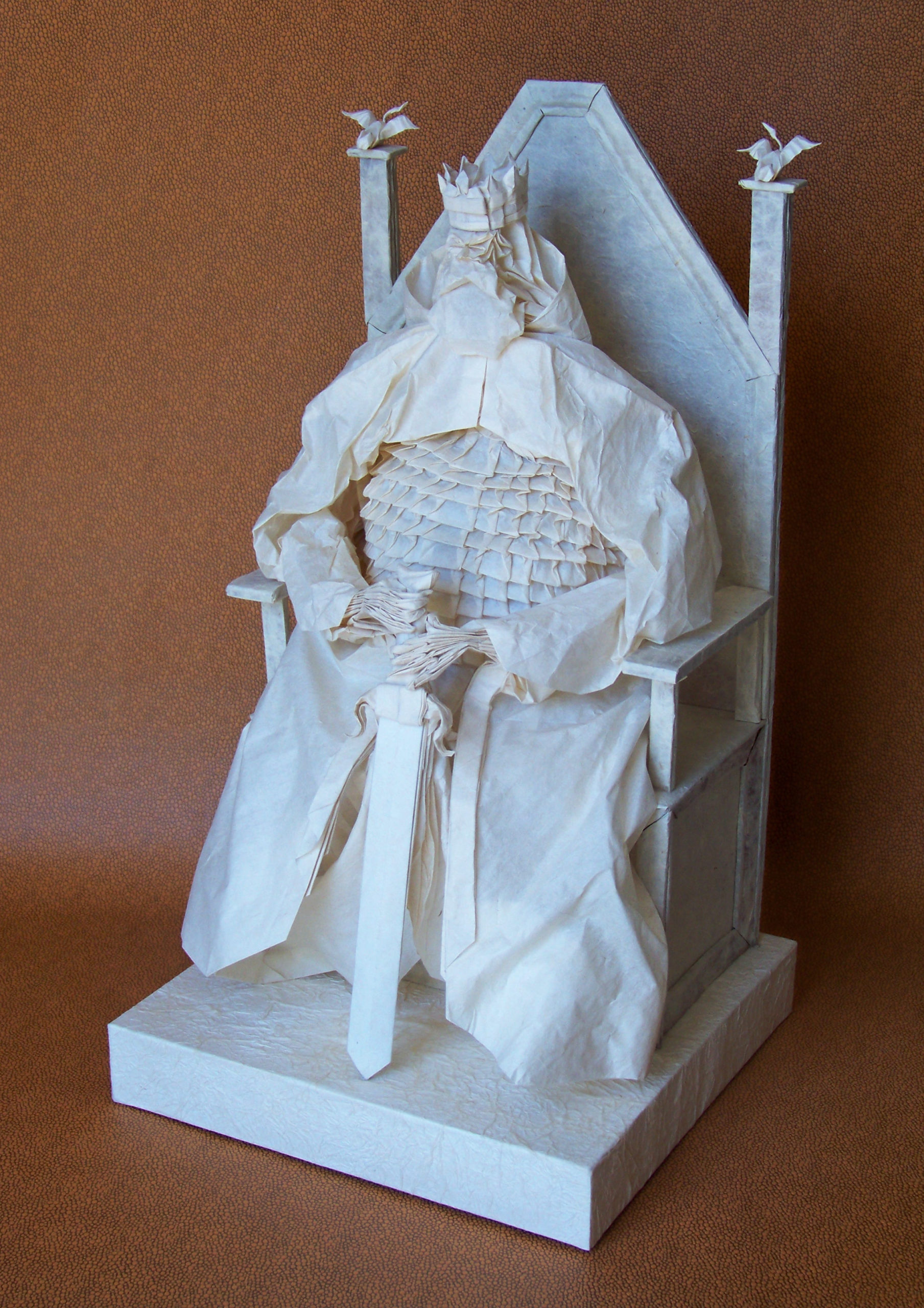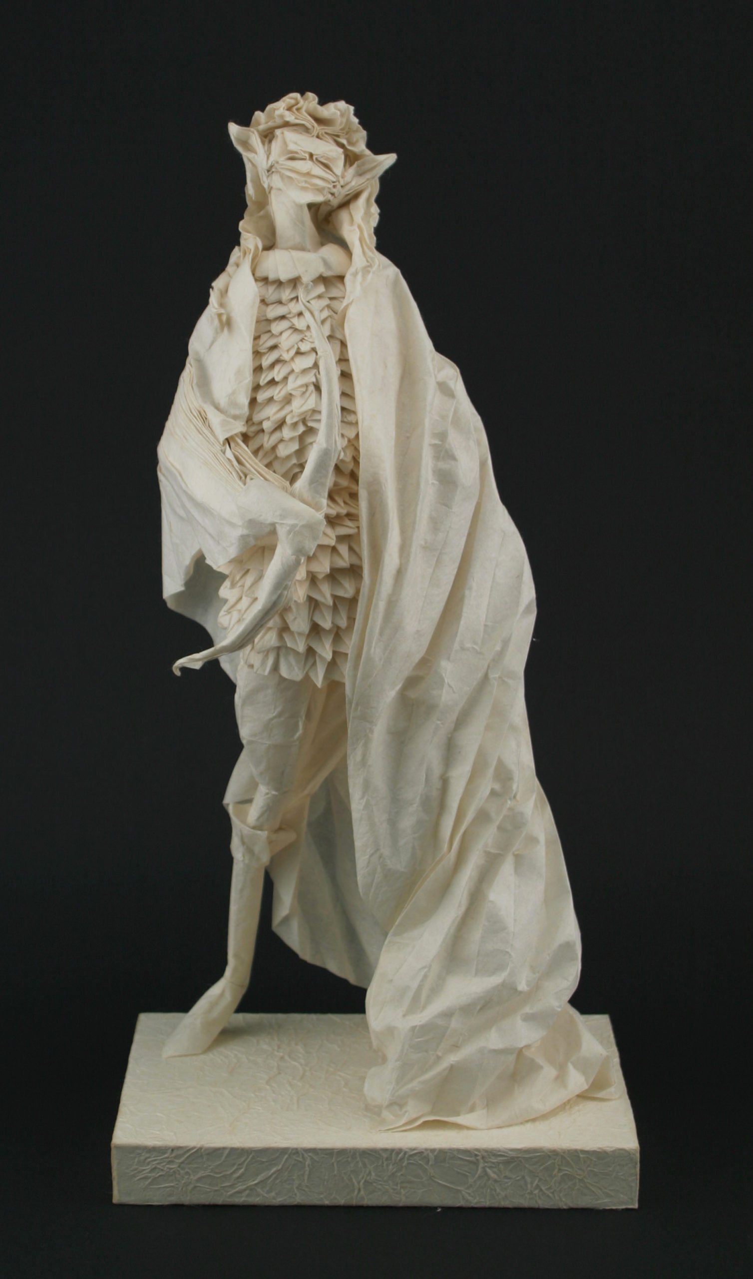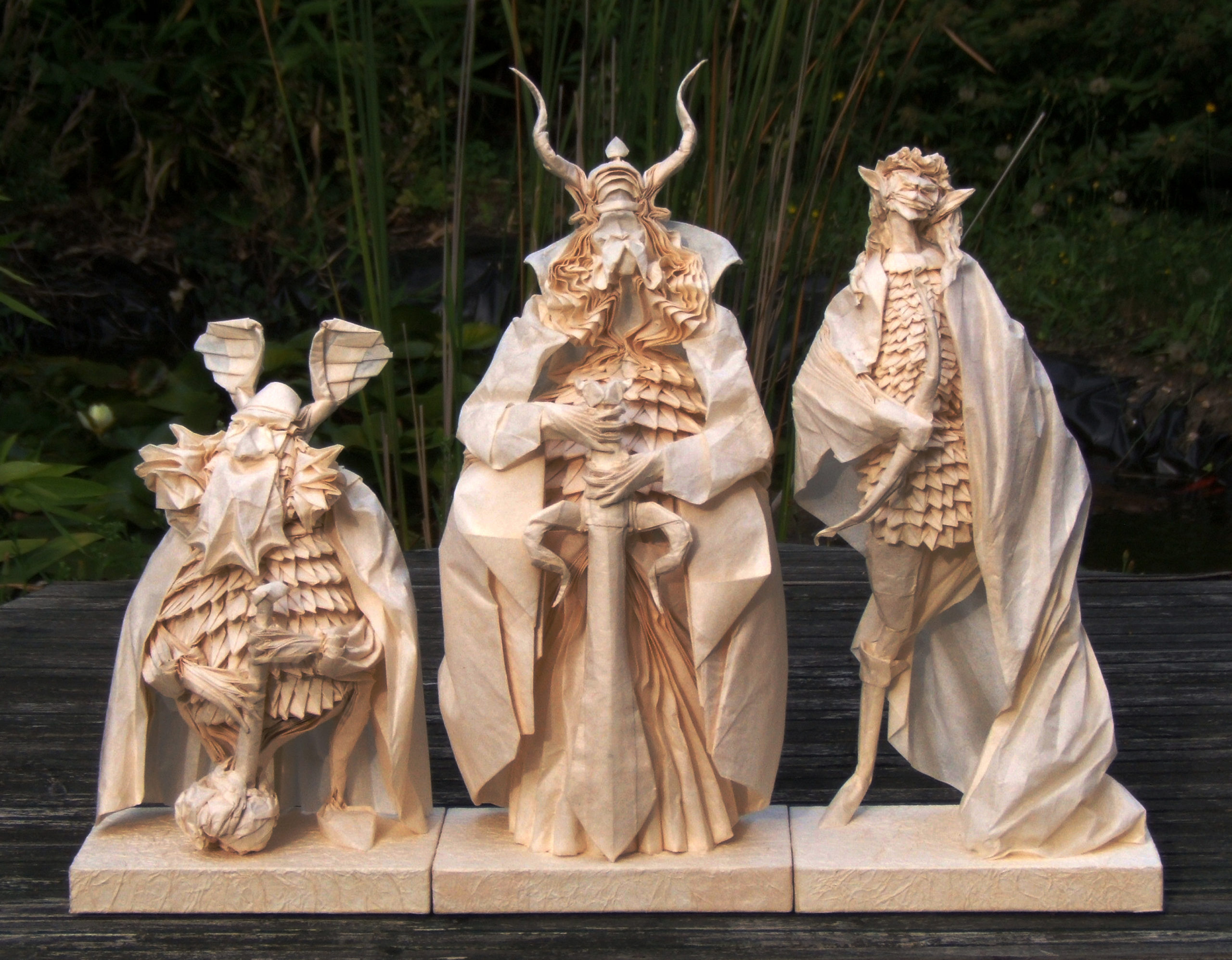 Il serait difficile de produire de tels objets sans utiliser la technique du méthyl-cellulose et du pliage humide, ni la structure métallique qui maintient le modèle dans la forme souhaitée, notamment lors des transports et des expositions. De plus, si ces personnages sont relativement grands par rapport à d’autres modèles d’origami, de nombreux détails sont très petits, et m’obligent à travailler avec certains outils de modelage (pour façonner l’argile normalement) ou avec une petite paire de pinces coupantes.